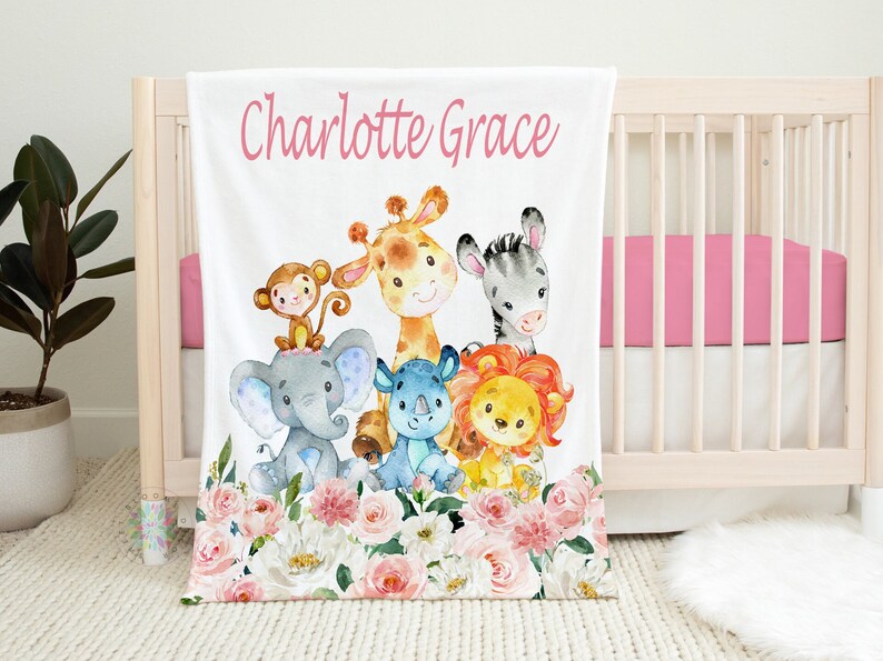 Safari Animals Floral Baby Blanket, Pink Flowers Roses Name Blanket, Newborn Monogram Baby Shower Gift Lion Elephant Giraffe