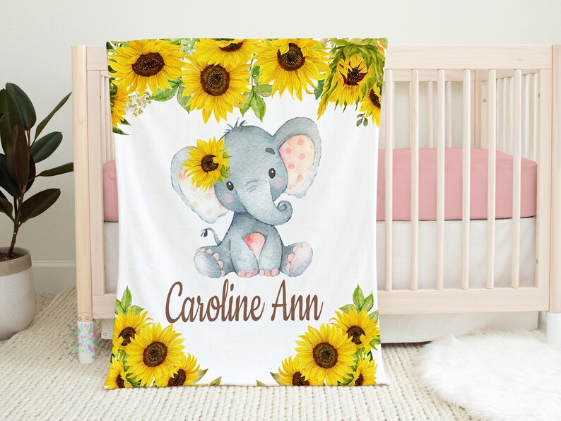 Sunflower Elephant Name Blanket, Yellow Floral Personalized Baby Shower Gift Newborn Nursery Sunflower