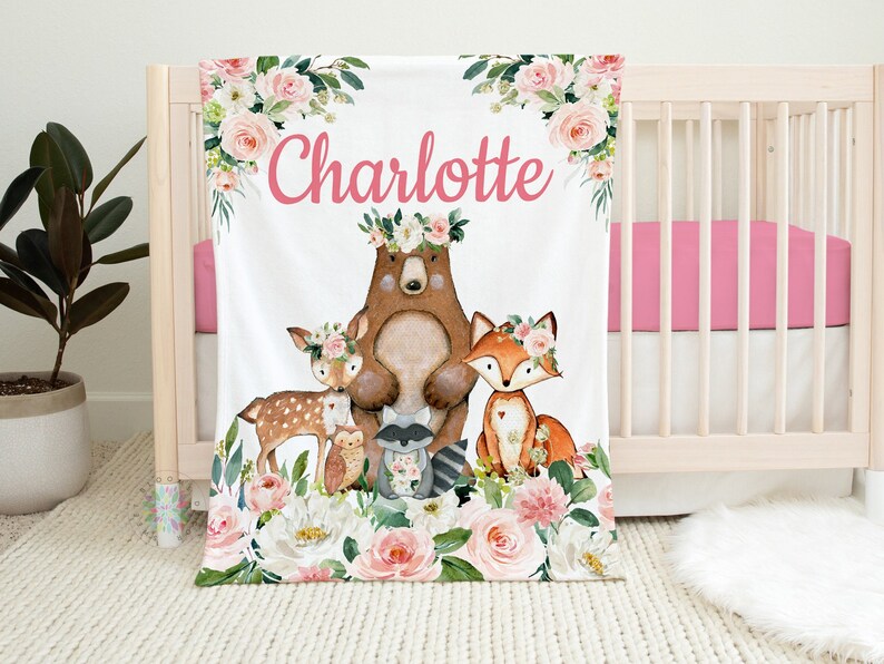 Woodland Animals Baby Floral Name Blanket, Blush Pink Flowers Roses Newborn Baby Shower Gift Forest Animals Nursery Bedding