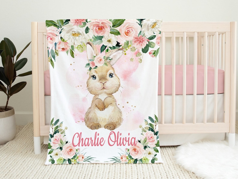 Bunny Rabbit Baby Name Blanket Blush Pink Floral Blanket Newborn Baby Monogram Flowers Baby Shower Gift Bunny