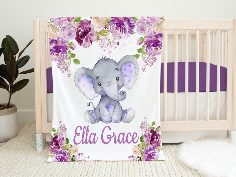 Elephant Floral Name Blanket Purple Lavender Lilac Flowers Personalized Monogram Baby Shower Gift Nursery Decor