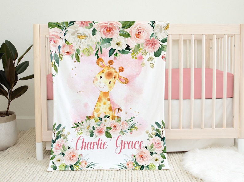 Giraffe Floral Baby Blanket, Giraffe Blush Pink Flowers Roses Personalized Newborn Baby Name Blanket Baby Shower Gift Bedding