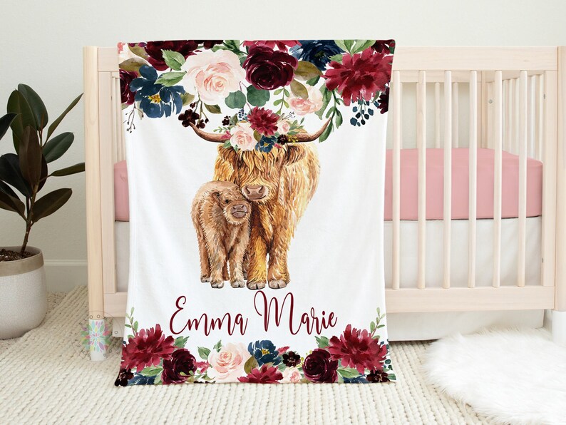 Cow Floral Name Blanket, Highland Cow Baby Burgundy Red Blush Pink Gild Navy Blue Maroon Watercolor Flowers Baby Shower Gift