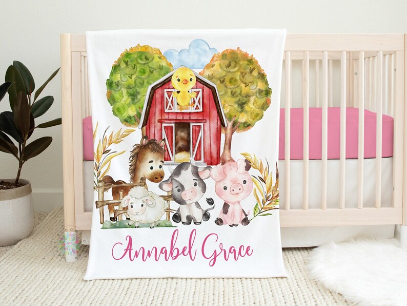Farm Animals Blanket, Farmhouse Cow Horse Sheep Pig Chicken Barnyard Baby Personalized Name Baby Shower Gift Blanket