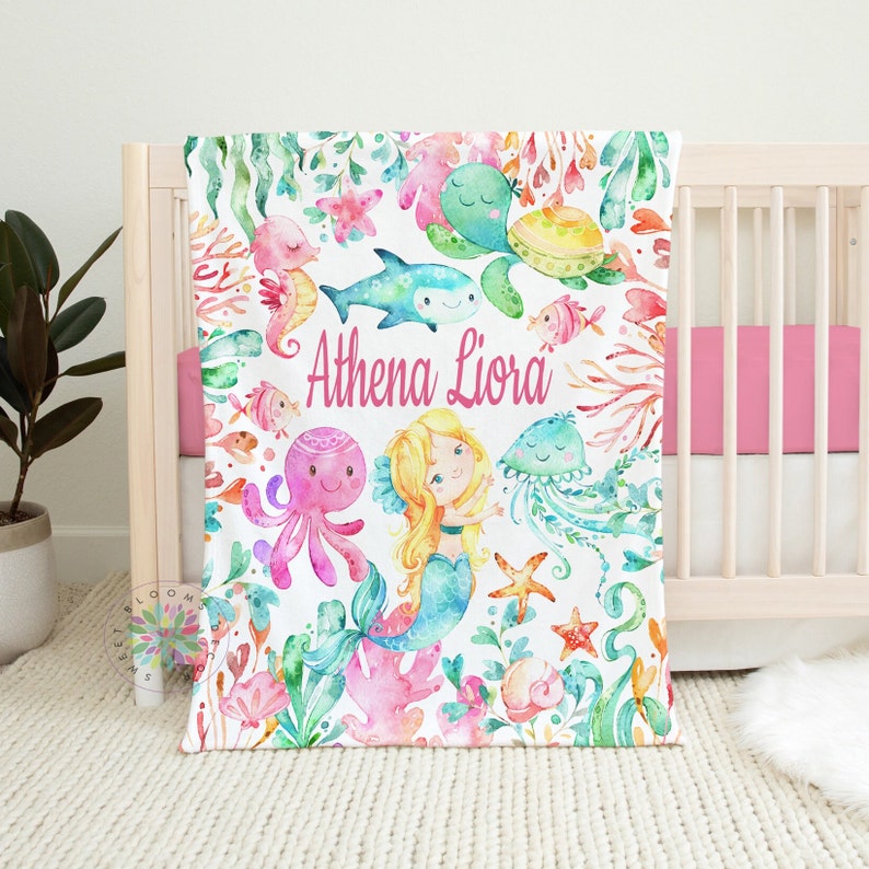Sea Animals Mermaids Baby Blanket, Personalized Baby Turtle Octopus Under The Sea Baby Shower Gift Nursery Bedding