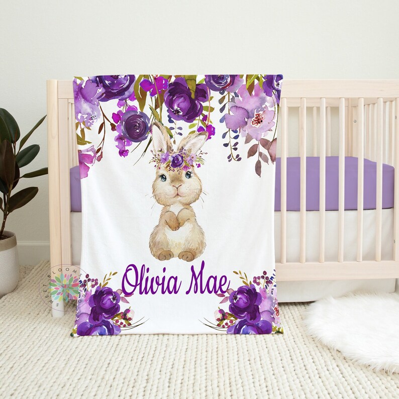 Bunny Rabbit Baby Blanket Floral Purple Lavender Plum Flowers Newborn Name Blanket Monogram Flowers Baby Shower Gift Bedding