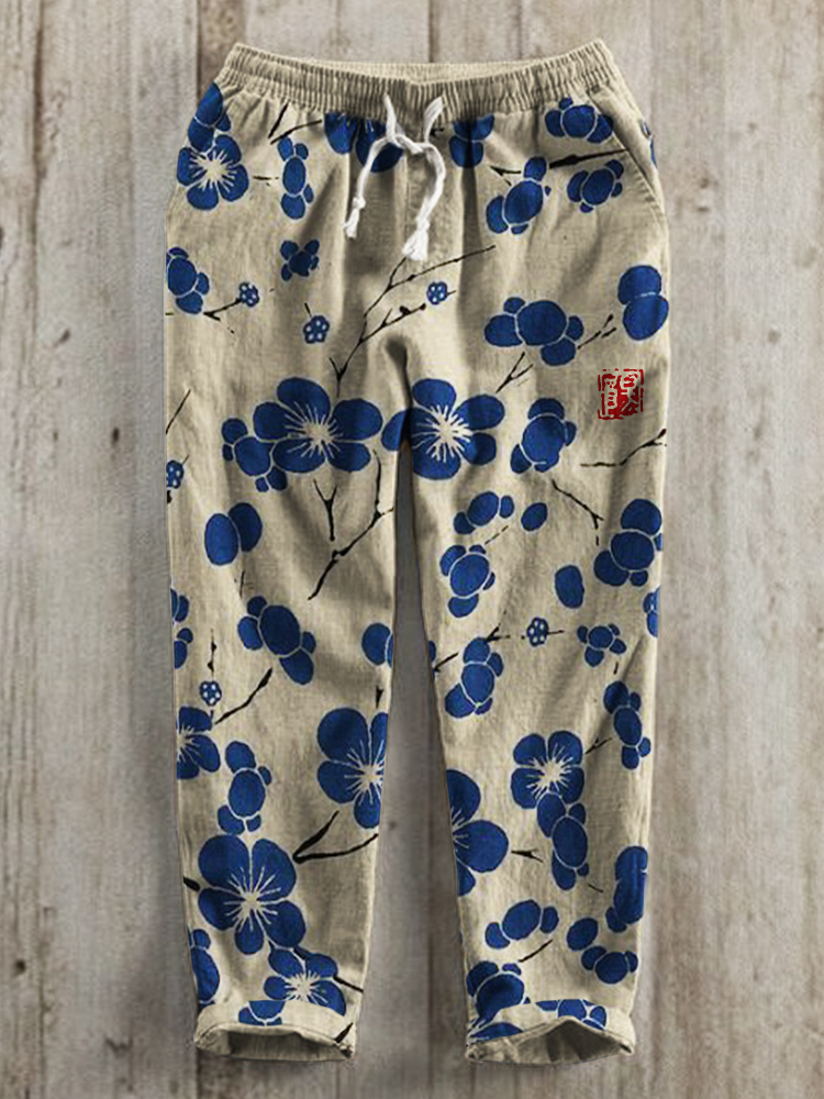 Cherry Blossom Japanese Lino Art Linen Blend Casual Pants