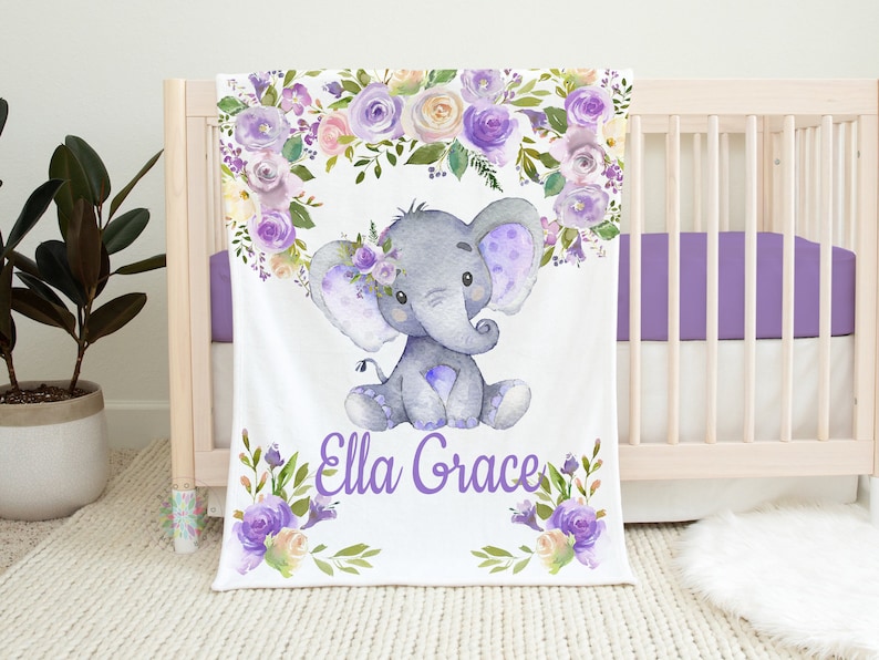 Elephant Baby Blanket Lavender Purple Lilac Floral Name Blanket Flowers Newborn Monogram Baby Shower Gift Bedding Nursery Decor