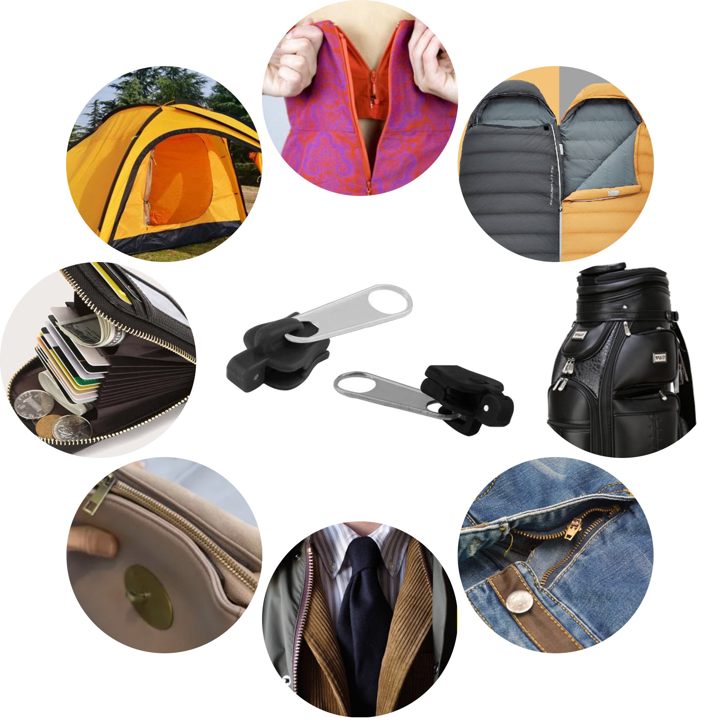 - DURABLE & PRACTICAL - Universal Sizes. Works on most common zipper mishaps including split zipper tracks, broken sliders and up to 3 missing teeth. It fits for jeans, skirts, golf duffle bags, sleeping bags, purses, jackets, suitcases, tents, etc.