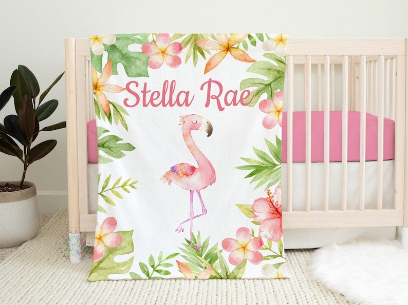 Flamingo Baby Blanket, Tropical Flowers Leaves Name Blanket Baby Shower Gift Jungle
