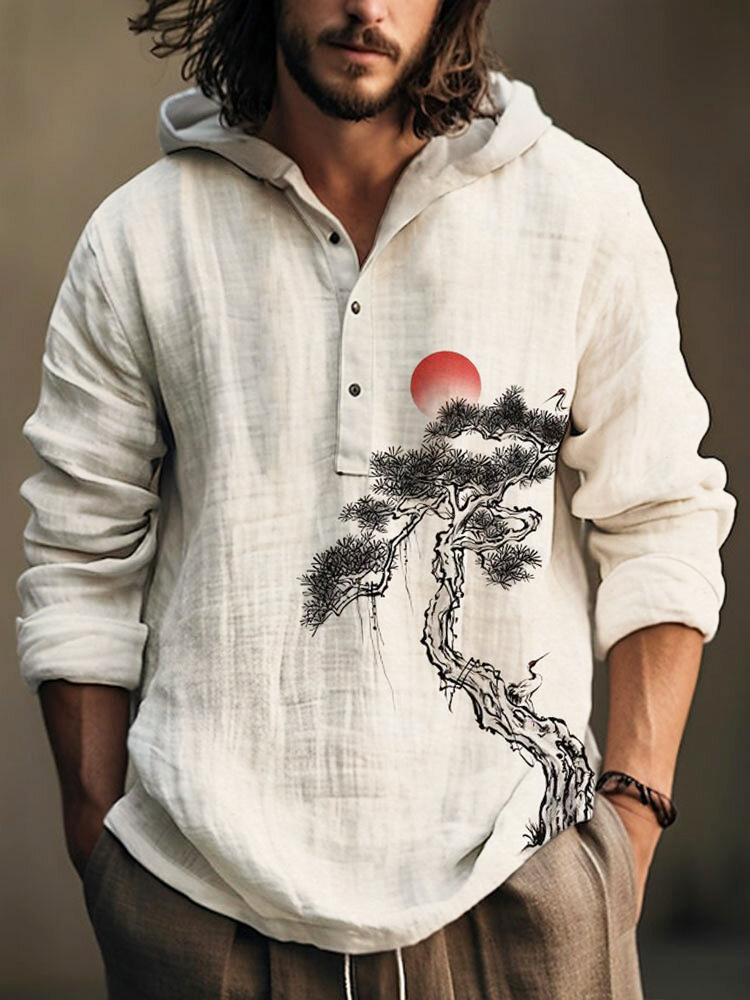 Ink and Pine Japanese Art Print Linen Hooded Long Sleeve Shirt