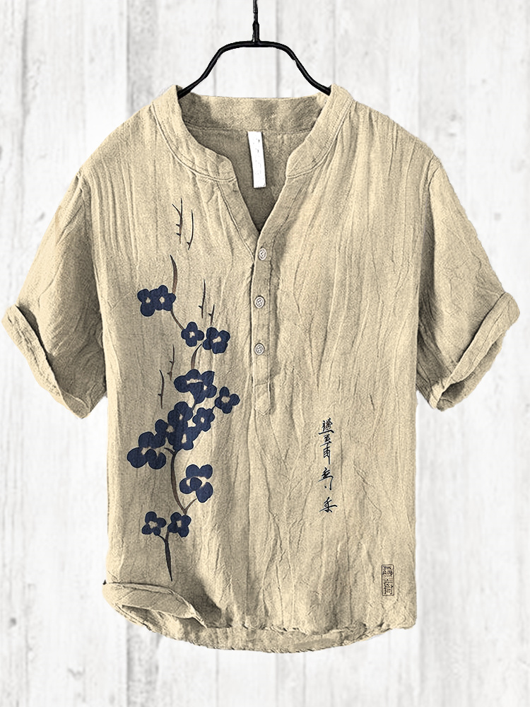 Japanese Floral Art Print Cozy Cotton Linen Shirt