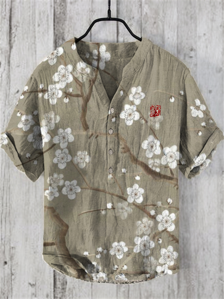 Japanese Plum Blossom Art Casual Linen Blend Shirt