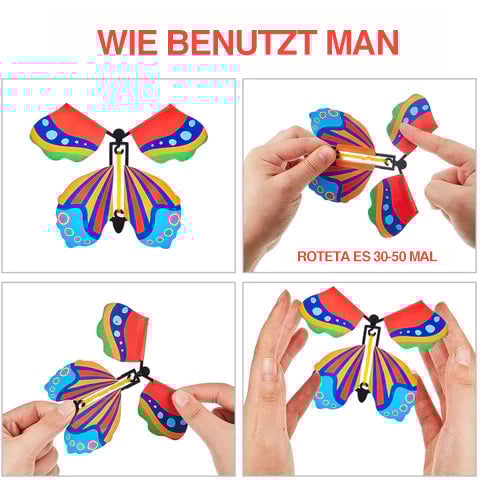 Hold the butterfly's tail with your left hand, and then rotate the butterfly's head with your right hand about 30-50 times, and then loosen it. You can also put the butterfly toy in a book or card. As soon as he or she opens the book or card, the beautiful butterfly flies out and surprises her.