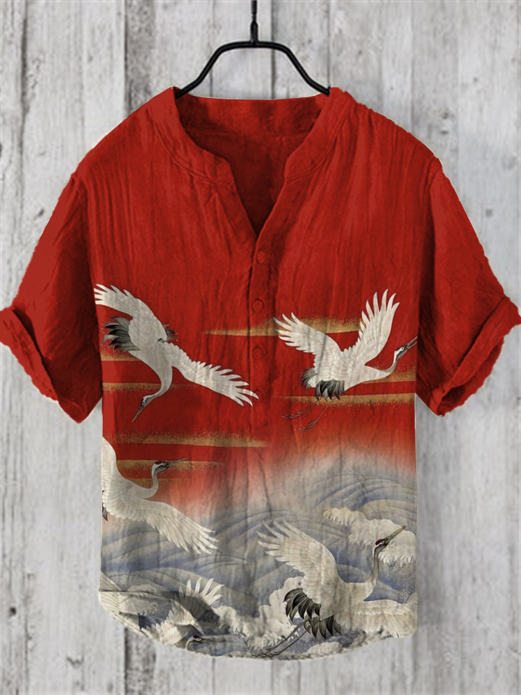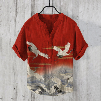Men's Japanese Crane V Neck Casual Linen Blend Shirt