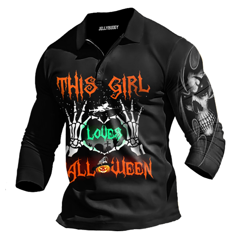 Men's This Girl Loves Halloween Skull Print Long Sleeve Polo Shirt