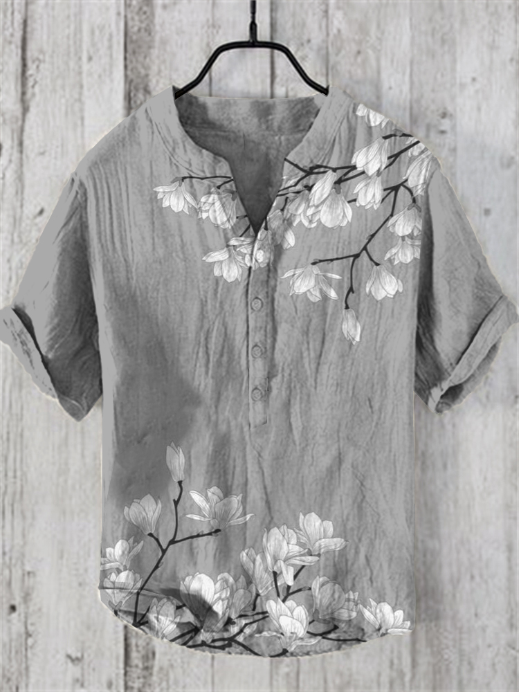 Men's Vintage Japanese Art Magnolia Flower V Neck Casual Linen Blend Shirt