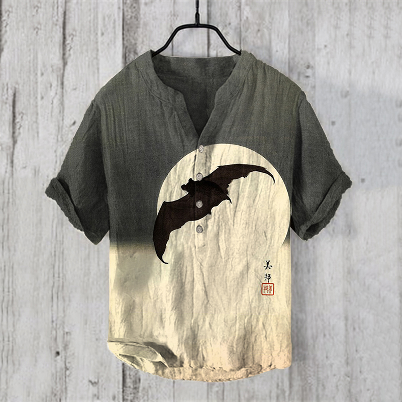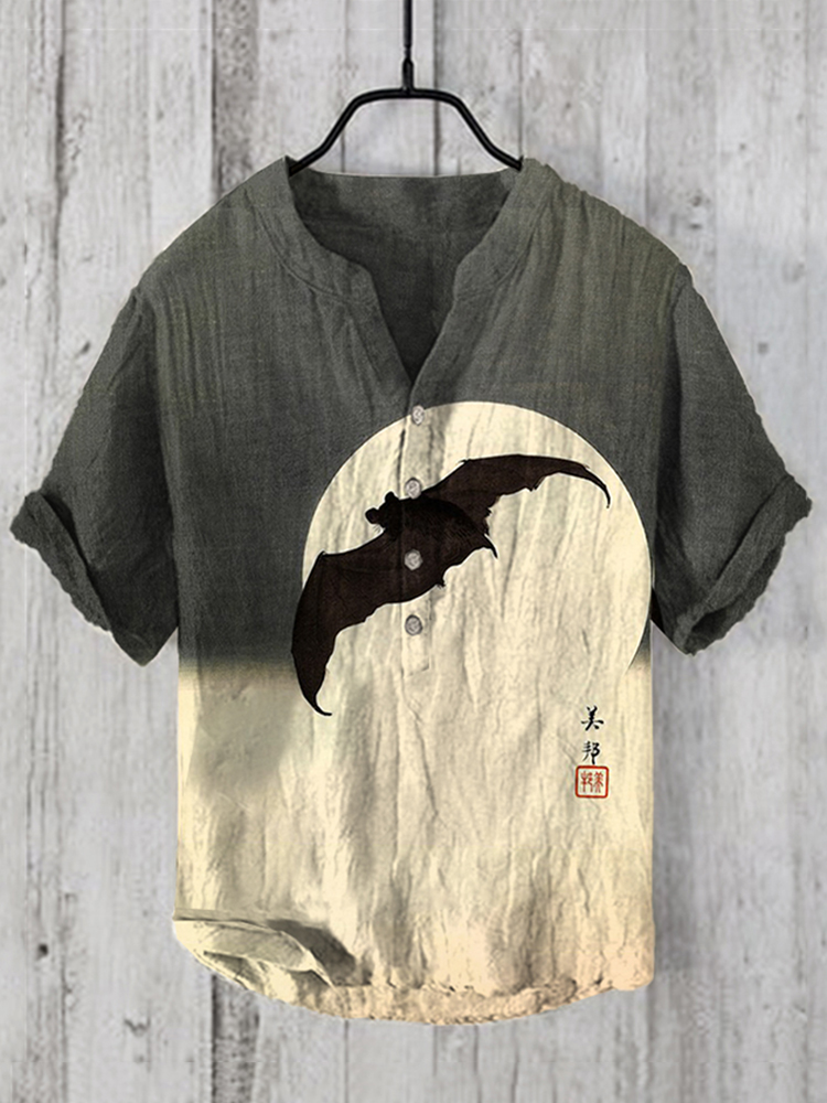 Men's Vintage Japanese Art V Neck Casual Linen Blend Shirt