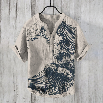 Men's Vintage Sea Wave Lino Art Linen Blend Shirt