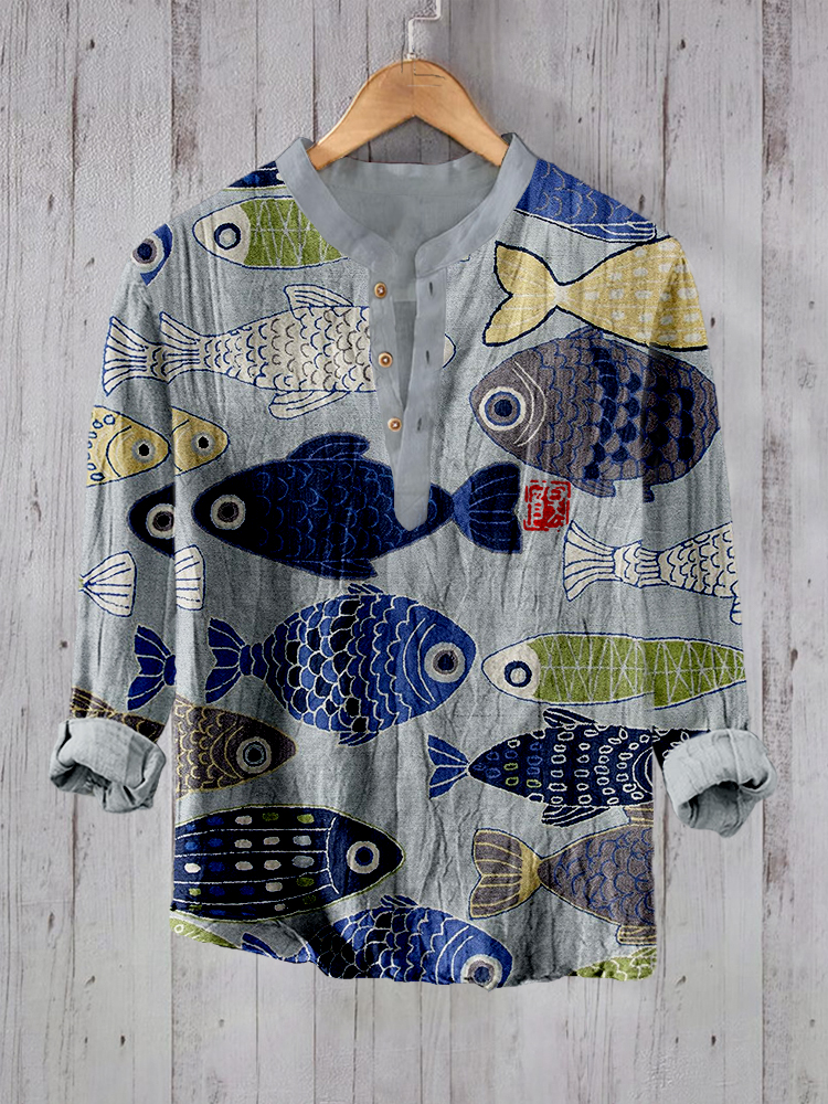 Vintage Fish Japanese Art Linen Blend Casual Shirt