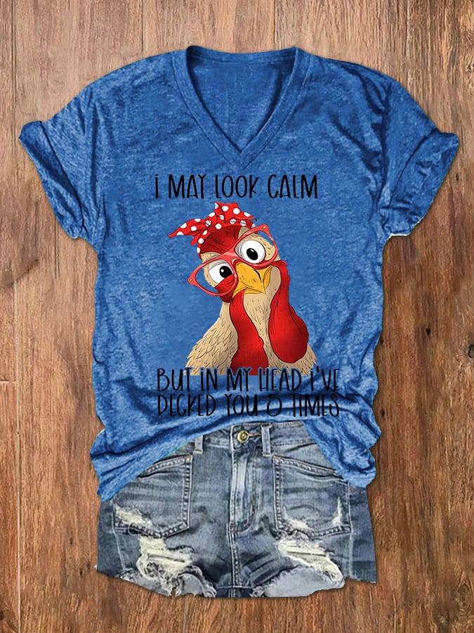 Women's Funny Chicken I May Look Clam But In My Head I've Pecked You 5 Times Casual V-Neck Tee
