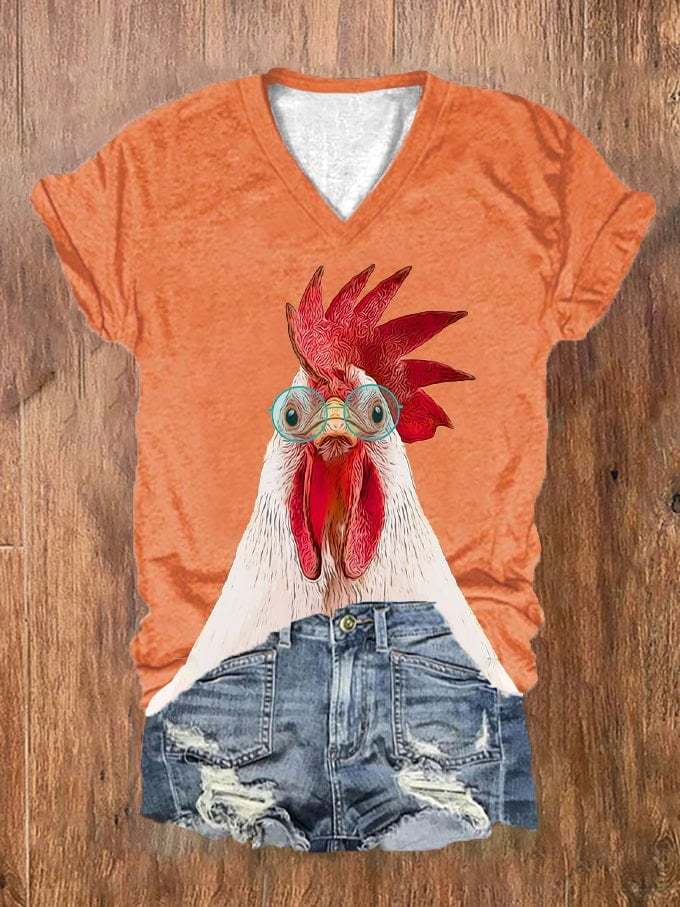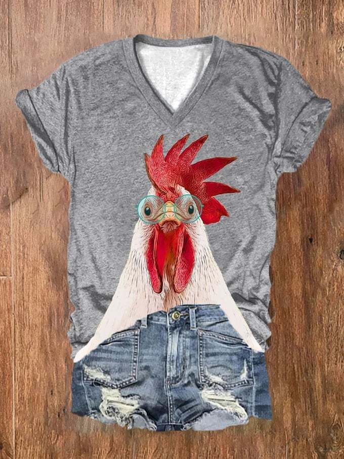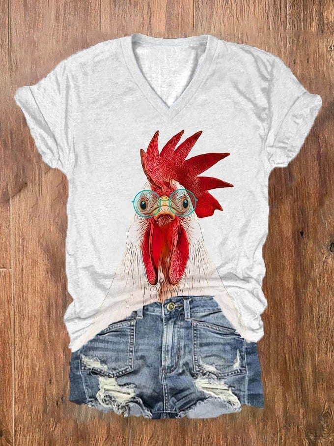 Women's Funny Glasses Animal Rooster Print V-Neck T-Shirt