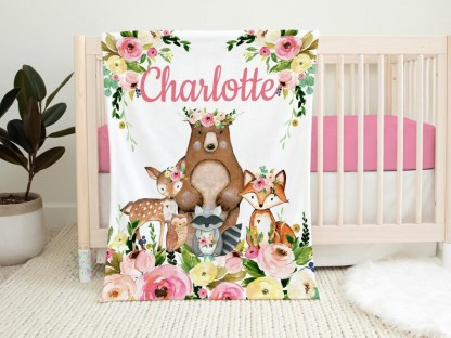 Woodland Baby Blanket, Baby Personalized Blush Pink Roses Flowers Forest Baby Shower Gift Forest Nursery Bedding